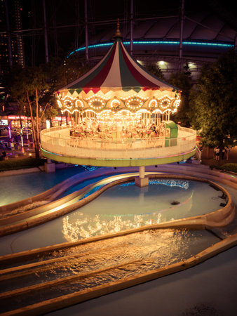 Vibrant and magical carnival atmosphere with blurred bokeh effect illuminating the night sky