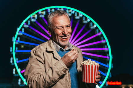 A brightly lit Ferris wheel and amusement park rides glow against the night sky, creating a vibrant and festive atmosphere.