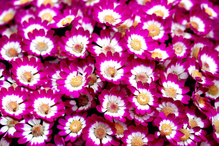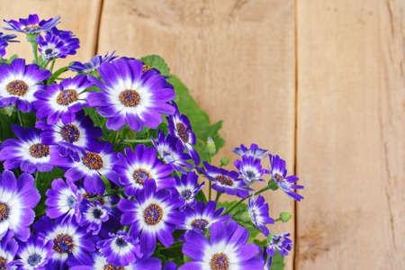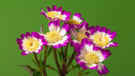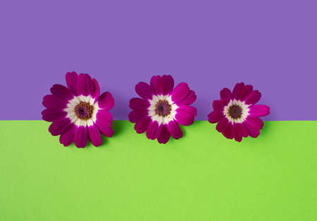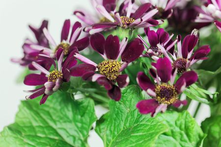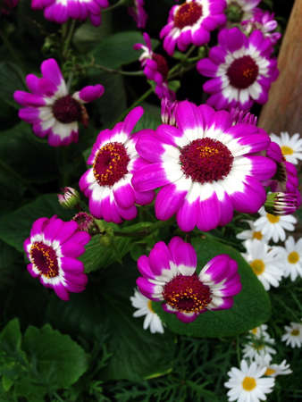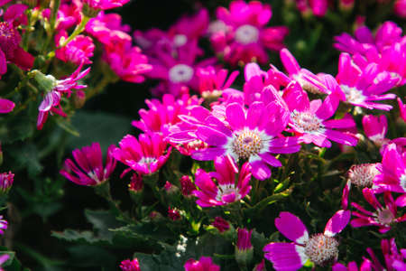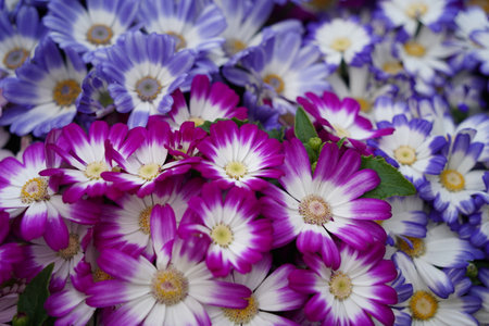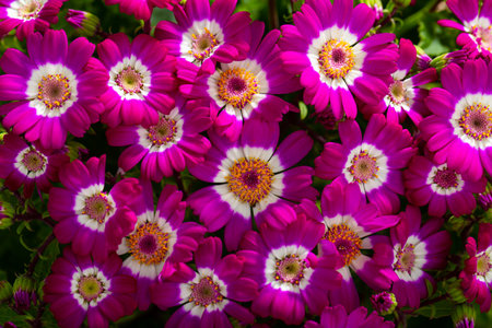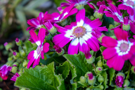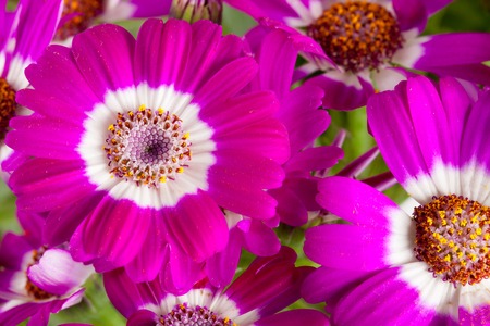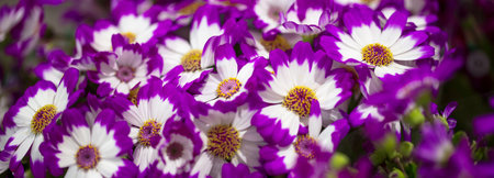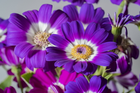 Beautiful Pericallis x hybrida, also known as Florist's Cineraria or Common Ragwort. White and magenta pink flowers background