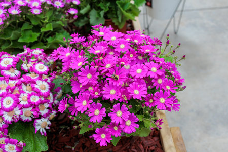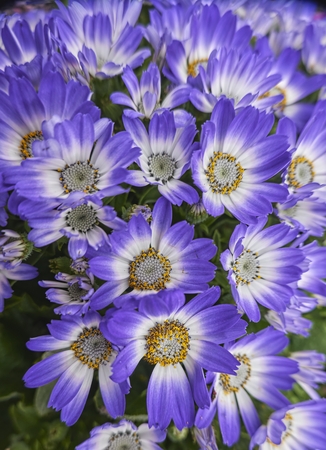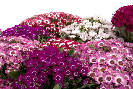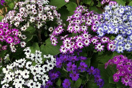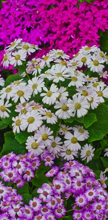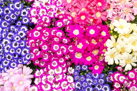 Pink and white cineraria flowers blooming in a pot forming a full frame background