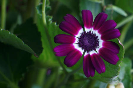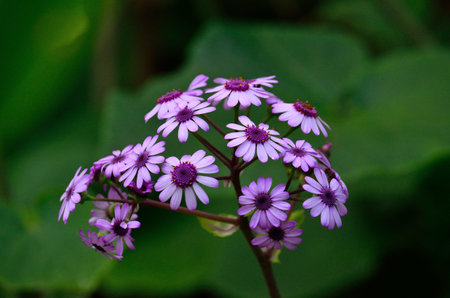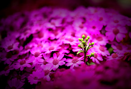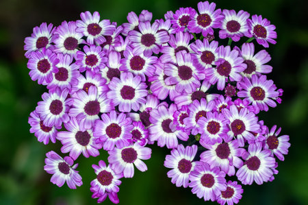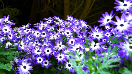 Close up of Cineraria flora, Pericallis, Florists' Cineraria (purple and white Cineraria x hybrida) at night using flash