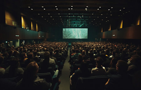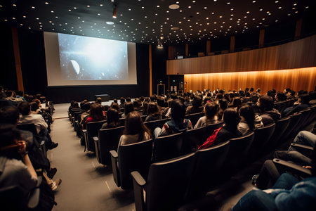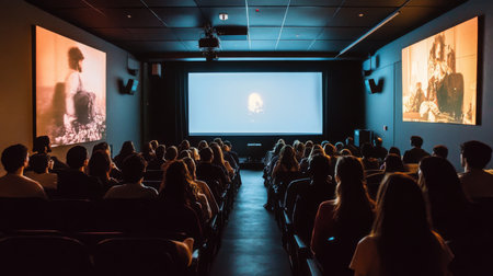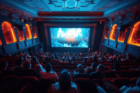 A large audience gathers in a contemporary theater to enjoy a film. The screen displays a captivating array of warm colors, enhancing the lively atmosphere.