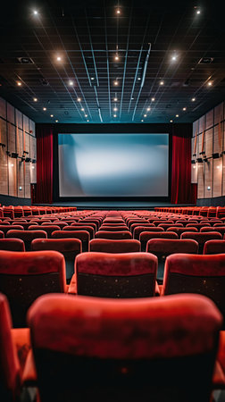 A spacious empty movie theater featuring rows of red seats, a large blank screen, and ambient lighting, showcasing a modern cinematic environment ready for film presentations.