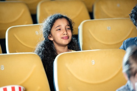 Selective focus of young girl watching movie in cinema, sitting in comfortable seat, wearing pink casual outfit. Side view of smiling caucasian girl enjoying film with friends. Entertainment concept.
