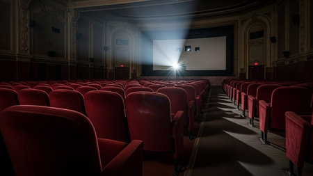 A cinematic wide shot (16:9) of an empty, historic movie auditorium dominated by a powerful beam of