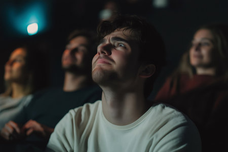 Young man is feeling emotional and crying while watching a drama movie at the cinema, surrounded by other people