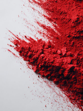 Vibrant red powder is scattered across a mirror surface, creating an artistic splash and contrasting sharply with the clean white margin on the side.