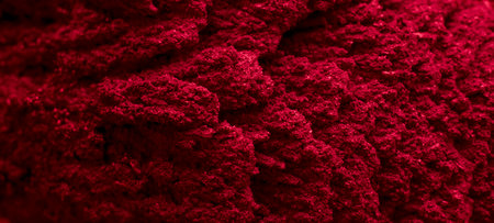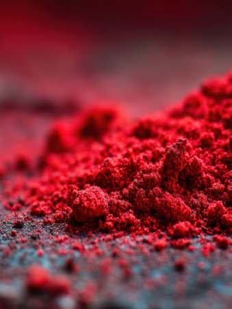 Rich texture of red sindoor powder fills the frame with fine granules highlighted against a softened background, showing its vibrant hue and detail.