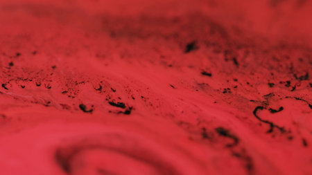 Soft glitter structure. Draw fluid. Red black color shimmering particles acrylic ink water marble blend wave abstract art background.
