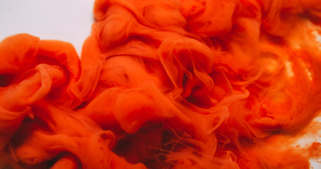 Shiny haze. Paint flow. Blur orange bronze swirl chemical acrylic emulsion smoke pigment spreading on abstract white art background.