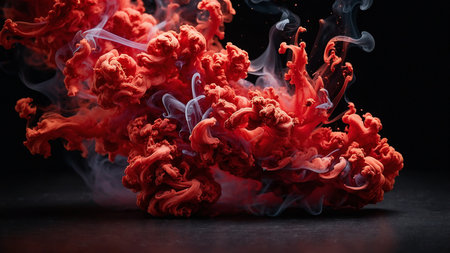 A captivating and surreal image of swirling, dense red smoke clouds blending with dark, curling wisps, evoking a sense of mystery. It showcases the ethereal beauty of vapor and contrast. AI generated image