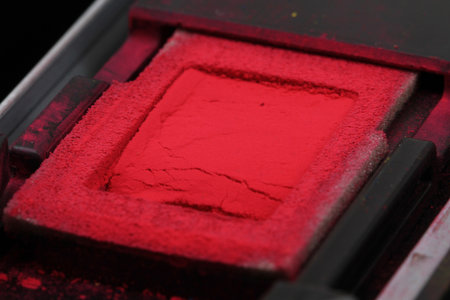 Red powder is spread on a mirror, contrasting sharply with the clean white border for a striking abstract effect.