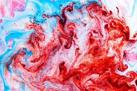 Bright fluid. Paint flow. Strange abstract red bloody curls leaking wavy. Enamel defocused dye vivid mix decorative background with swirl effect.
