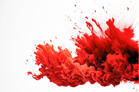 Abstract red paint splatters on a white background, showcasing vibrant colors and dynamic textures for artistic designs