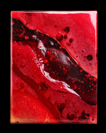 Top-down view of semiprecious crimson tile featuring glossy surface, deep red inclusions, and lava-like organic formations. Intense and abstract composition for luxury design.