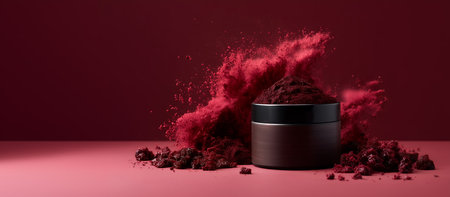 Creative template concept. A bottle jar with molten scrub surrounding burst explode with dust powder particle on red maroon background . Mock up presentation. copy text space. long