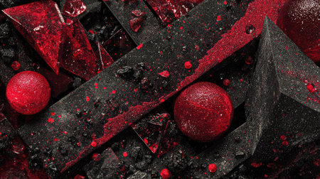 An abstract composition features red spheres and angular geometric shapes arranged on a dark, textured surface. The image presents a blend of color and form, using high contrast and an artistic style. It could be used for various commercial purposes, including graphic design, advertising, and editorial content.
