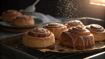 AI Generated. Freshly Baked Cinnamon Rolls with Icing and Steam in Warm Sunlight