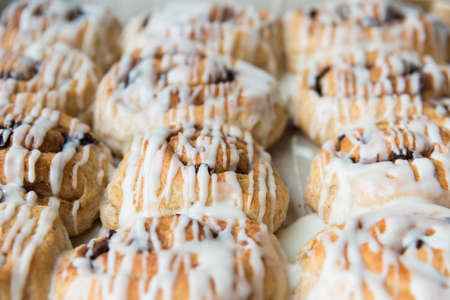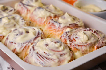 homemade Sinnabon buns with cinnamon and white cream sauce. sweet traditional dessert buns.