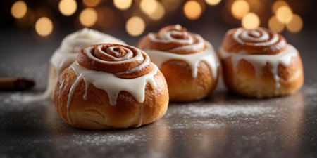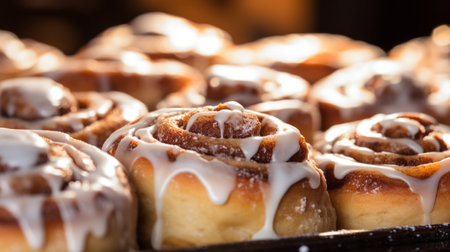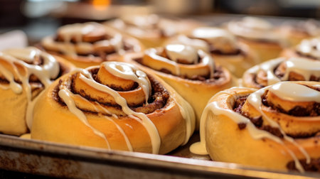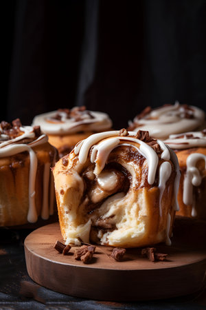 AI Generated. Close Up of Delicious Cinnamon Rolls with Icing
