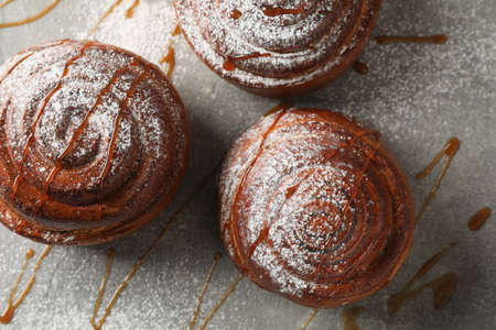 Cinnamon rolls with caramel and powdered sugar on grey background, top view