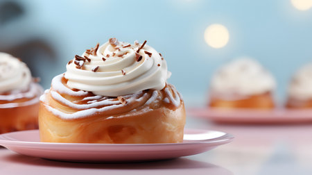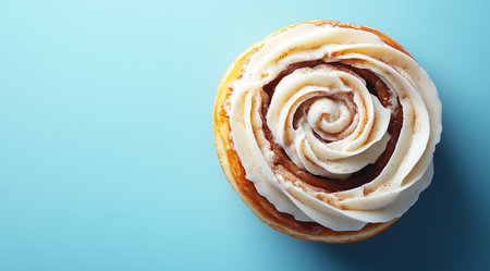 Cinnabon with cream on a blue background top view with space for text, created with Generative AI technology