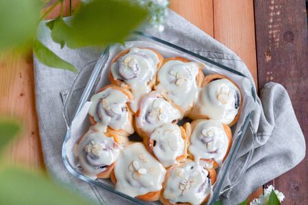 Fresh tasty cinnamon rolls with cream and almonds on a wooden table with white turns of lilac on a sunny day
