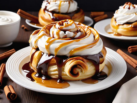 AI Generated. Cinnamon roll dessert on a plate with sweet glaze and cinnamon sprinkles