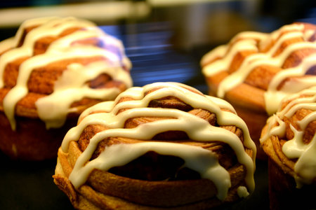Bakery showcase featuring golden swirls with icing, caramel, and cinnamon