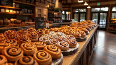 Freshly baked cinnamon rolls lined on a rustic counter in a cozy bakery during the afternoon rush. Generative AI
