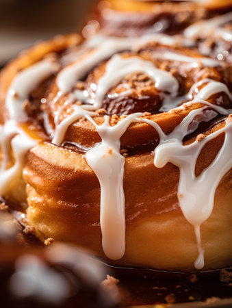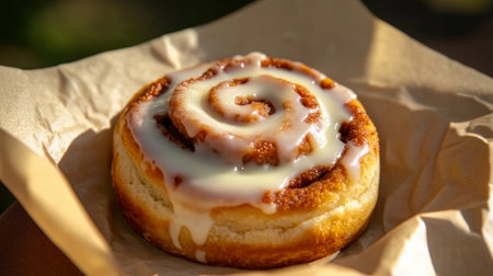 Freshly baked cinnamon roll covered in sweet icing, creating a tempting treat