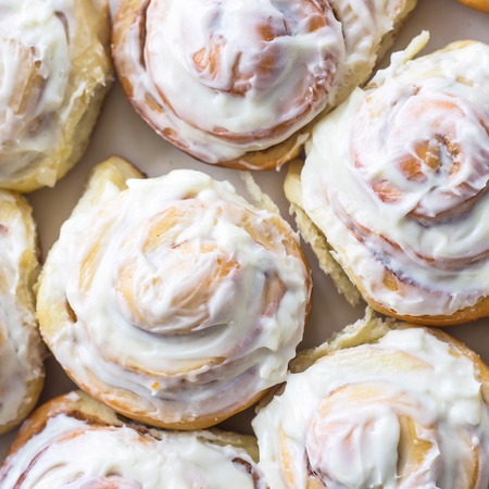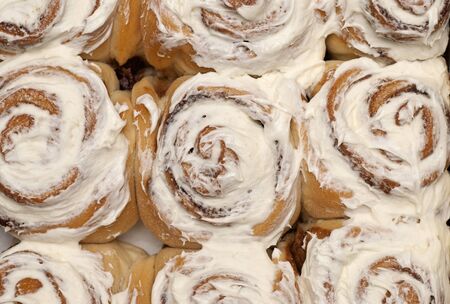 Full-frame freshly frosted cinnamon rolls in pan close-up
