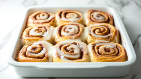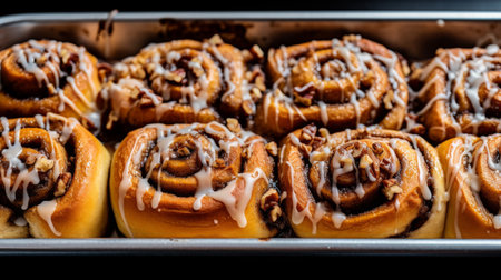 A tempting display of freshly baked cinnamon rolls drizzled with creamy icing, perfect for a cozy breakfast or snack. Ideal for culinary enthusiasts.