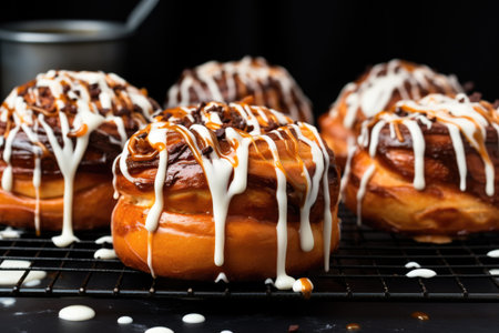 Generative AI Cinnamon rolls with swirls of aromatic spices, topped with a cream cheese glaze, cooling on parchment paper