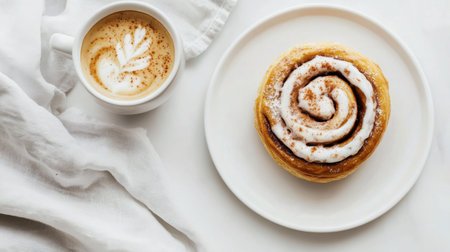 A stylish flat lay of a creamy latte and a freshly baked cinnamon roll on a white background.