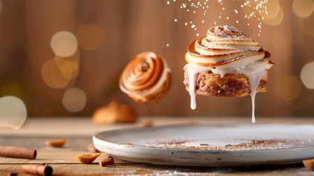 A beautifully crafted cinnamon roll with creamy frosting floats above a rustic plate, surrounded by a warm, cozy atmosphere with bokeh lights in the background.
