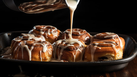 Close-up rich freshly baked cinnabon roll with sweet glaze on a black background. Generated AI content.