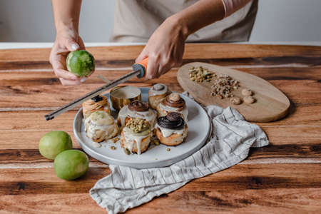A woman's hands getting a fresh zest from the lime and put it to cinnamon rolls