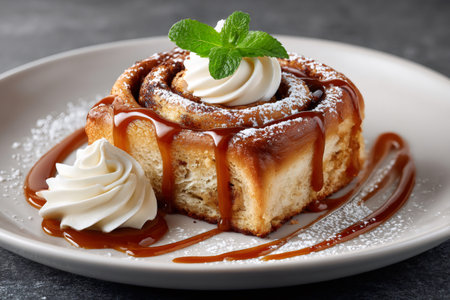 Cinnamon roll on a plate, drizzled with caramel and powdered sugar, garnished with whipped cream and mint