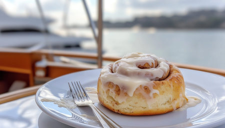 Freshly baked cinnamon roll, generously drizzled with icing, sits on a white plate with a fork, overlooking a picturesque yacht harbor