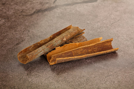 Closeup detail - Heap of cinnamon bark sticks on white stone like desk