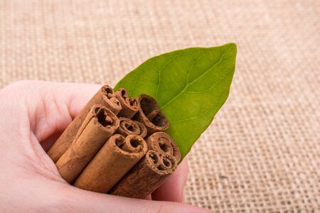 bundle of cinnamon sticks on a linen canvas background