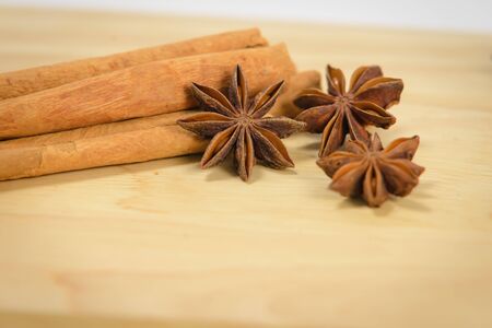 Cinnamon sticks and star anise spice on wooden board