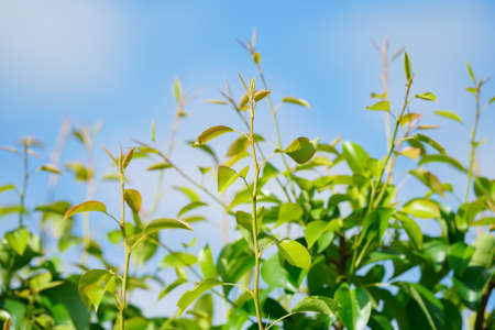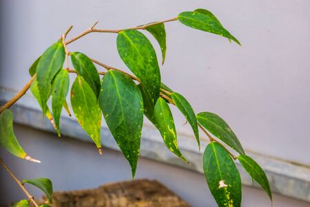 Close-up of Green tropical leaves of Cinnamon (Cinnamomum verum).