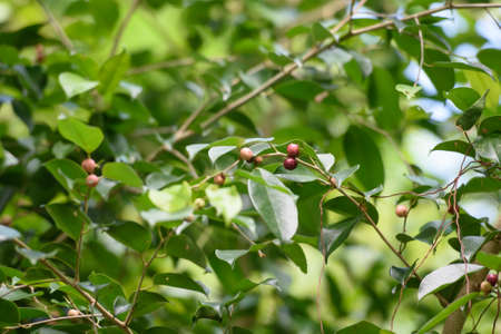 Young unripe fruits Mimusops elegi or Bullet wood growing on branch with leaves in Thailand. Another name is Bullet cherry, Spanish cherry, Bokul or Medlar.
