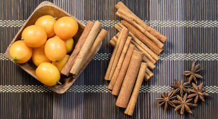 Fragrant cinnamon sticks and sweet kumquat in wooden bowl
