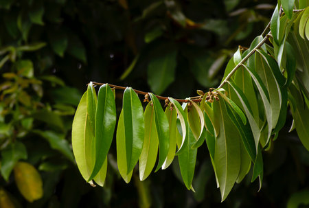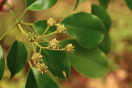 Indonesian dark wood, Ebony (Diospyros celebica) green leaves, seeds and flowers