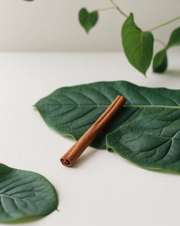 AI Generated. Cinnamon Stick Resting on Lush Green Leaves