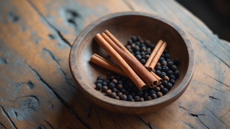 AI Generated. Wooden bowl with cinnamon sticks and black peppercorns on rustic table