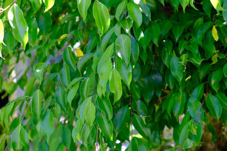 Background of tropical ornamental plants - ficus (fig tree). Asia. Public park, forest. Close-up. Perfect for a flyer, website background.